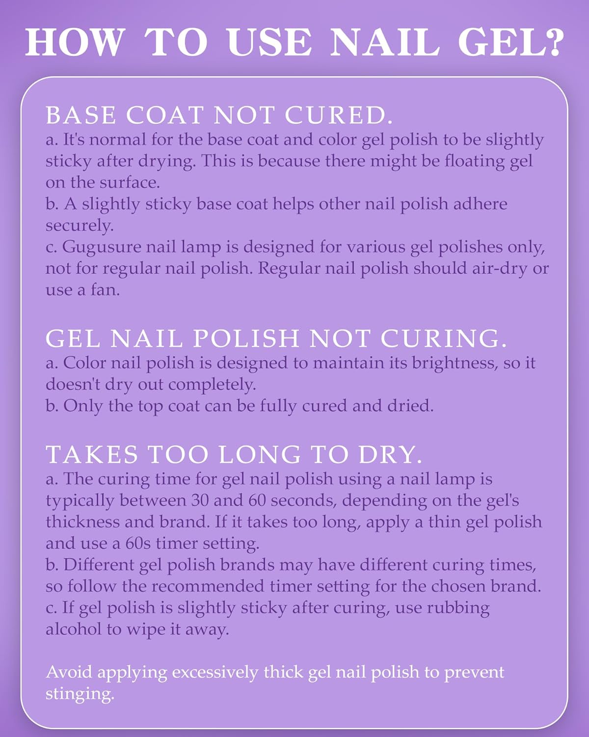 [Warm Tips 1]Our nail lamp is suitable for drying most UV-led gel nail polish, but please notice it can't dry the regular nail polish that no contain UV.The dry time depend on how much the UV ingredient in gels.More UV ,Dry more fast.Don’t apply the nail polish too thickly also will reduce the time to dry.