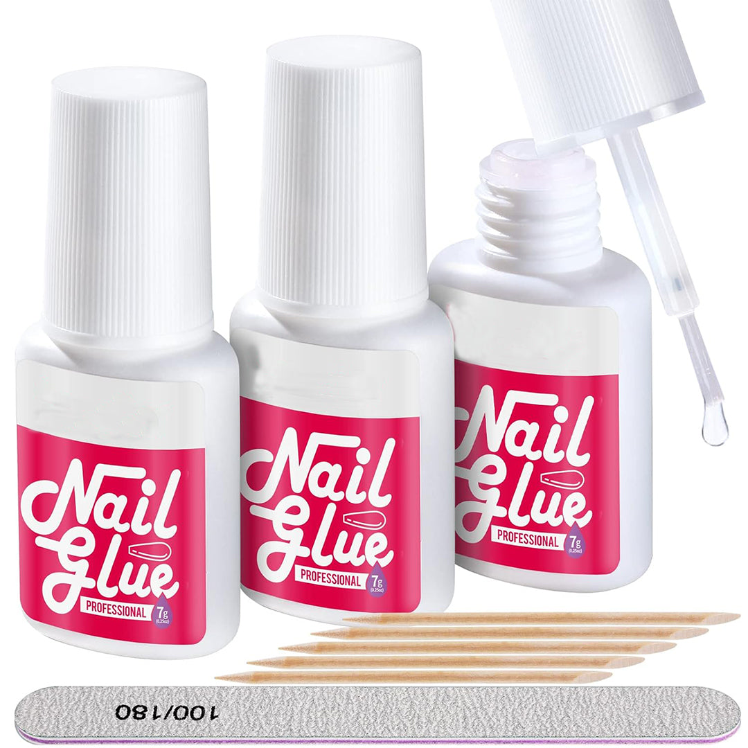 Long Glue On Nails 3 Pack for Press on Nails, Clear Glue On Nails for Gel Tips with Nail Files, Natural Nail Glue for False Nails Tips, Nail Glue For Natural Nails, Glue On Short Nails for Professional Fake Nail.